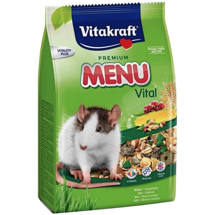 СКЛАД: Корм для щурів Vitakraft Menu Vital містить яловичину, рибу, птицю, злаки, олію рибного жиру, мінерали та вітаміни. Всі інгредієнти відповідають найвищим стандартам якості і безпеки. Ці компоненти складу забезпечують високу харчову цінність корму та задовольняють потреби щурів в поживних речовинах.