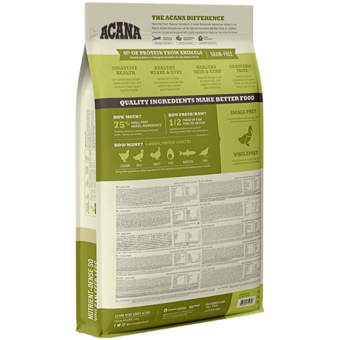 СКЛАД: Склад Acana Grasslands 4.5 кг (064992714727) включає в себе свіжу ягнятину (10%), сушену ягнятину (8%), свіжу качку (8%), сушену качку (8%), сушене яєчне білок (8%), цільну сушену скумбрію (7%), свіжу курку (6%), сушену курку (6%), сушену курячу печінку (5%), свіжу курячу печінку (5%), свіжу курячу шкурку (4%), свіжу курячу серцевину (4%), свіжий цільний сом (4%), свіжа куряча шийку (4%), зелений горошок, цільні жовтки, соняшникові олії, сушені водорості, сушені корені цикорію, сушена куркума, молочні зілля, бузина, лопух, ехінацея, марганець, цинк, вітамін Е (токоферол).