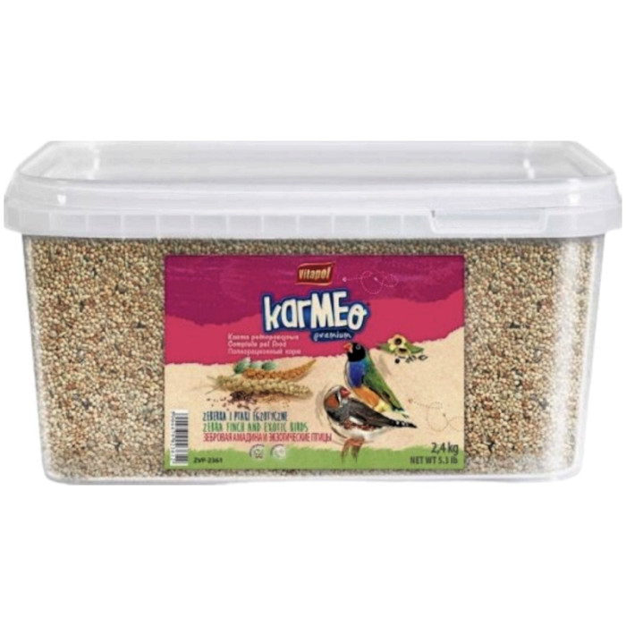 СКЛАД: Корм для зебрової амадини та екзотичних птахів Vitapol Karmeo Premium містить: смажені зерна, фрукти, насіння соняшнику, овочі, мед, цукровий глюкозний сироп, масло, живатку, дріжджі, плоди можжевелівого дерева, додаткові мінерали та вітаміни.