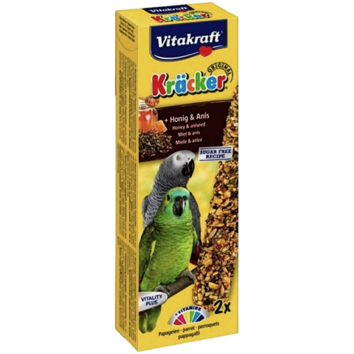 СКЛАД: Крекери для африканських папуг Vitakraft 2 шт з медом та анісом виготовлені з високоякісних інгредієнтів, таких як хлібна пшениця, мед і аніс. Запах меду і анісу стимулює апетит папуг, а пшениця забезпечує необхідну енергію та поживні речовини.