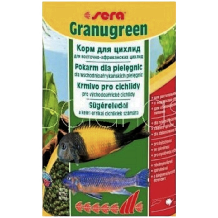 РЕКОМЕНДАЦІЇ: Рекомендується годувати рослиноїдних цихлід кормом Sera Granugreen два рази на день, в невеликих порціях. Корм слід залишати в акваріумі протягом 5-10 хвилин, після чого неспожите видно видаляти. Регулярне годування цим кормом дозволить забезпечити рибам необхідні поживні речовини та забезпечити їхнє здоров'я та активний ріст і розвиток.
