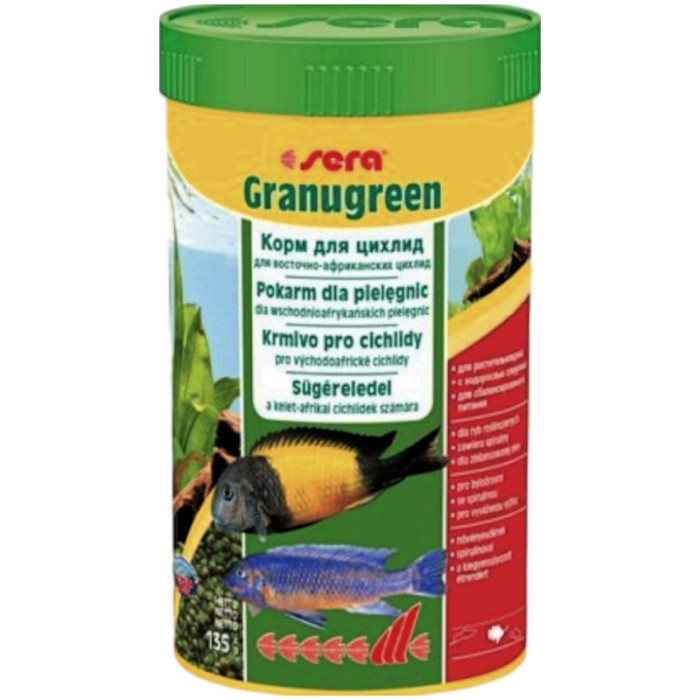 РЕКОМЕНДАЦІЇ: Рекомендується годувати рибу Sera Granugreen два рази на день в маленьких порціях, щоб запобігти перевищенню кількості корму в акваріумі. Достатньо 1 гранули на кожну рибу. Перед годуванням рекомендується занурити гранули в воду на декілька хвилин, щоб вони стали м'якими та зручними для риби. Регулярне використання Sera Granugreen допоможе підтримувати рибу в оптимальному стані та забезпечить їй необхідну кількість поживних речовин.