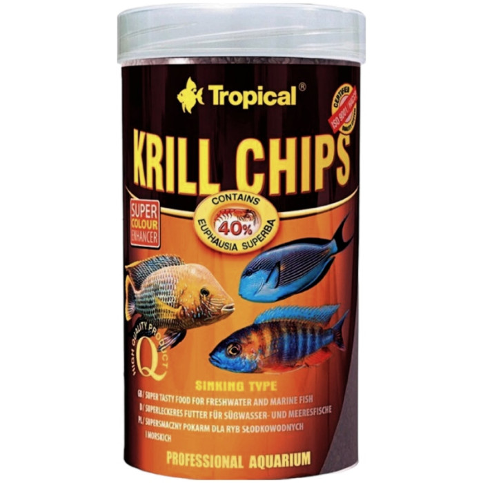 ОПИС: Корм для риб Tropical Krill Chips - це високоякісний корм у вигляді чипсів, призначений для годування акваріумних риб. Цей продукт містить унікальну комбінацію інгредієнтів, зокрема кріль, яка є важливим джерелом білка, амінокислот і природних пігментів для забезпечення здоров'я і яскравого забарвлення риби.