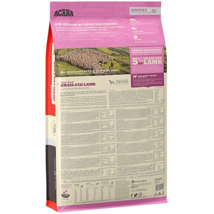 ОПИС: Acana Grass-Fed Lamb Dog - це сухий корм преміум-класу для собак із чутливим травленням. Цей корм містить найкращі інгредієнти, серед яких ягняче м'ясо, яке було вирощене на відкритому повітрі, свіжі фрукти та овочі, які були вирощені на місцевих фермах, та нашатирний корінь, який допомагає зберегти здоров'я шлунково-кишкового тракту.