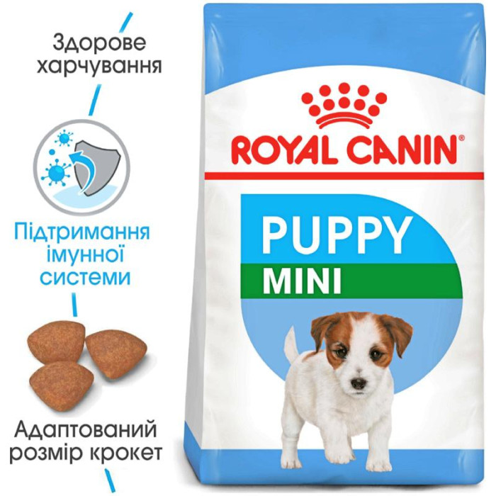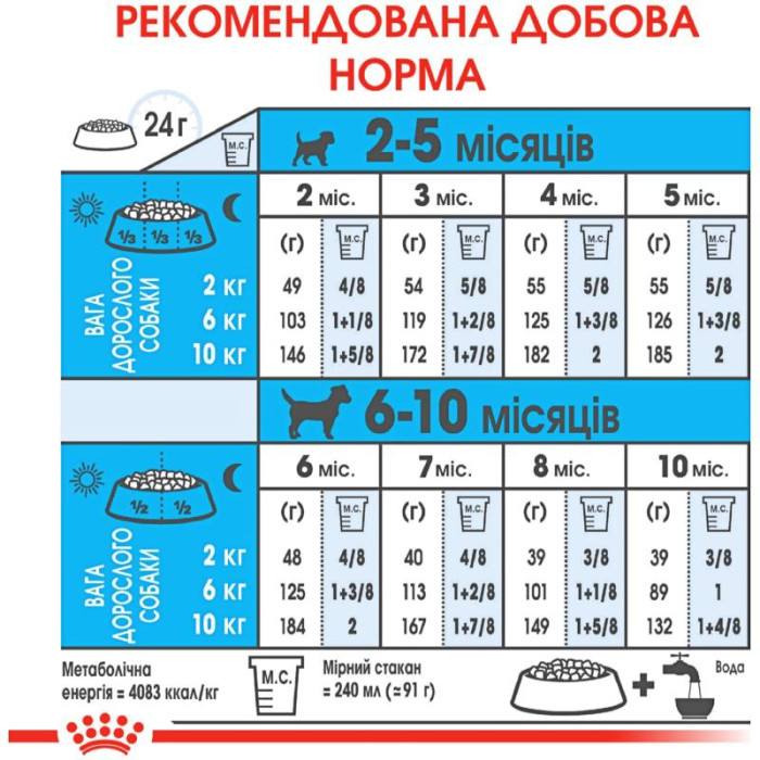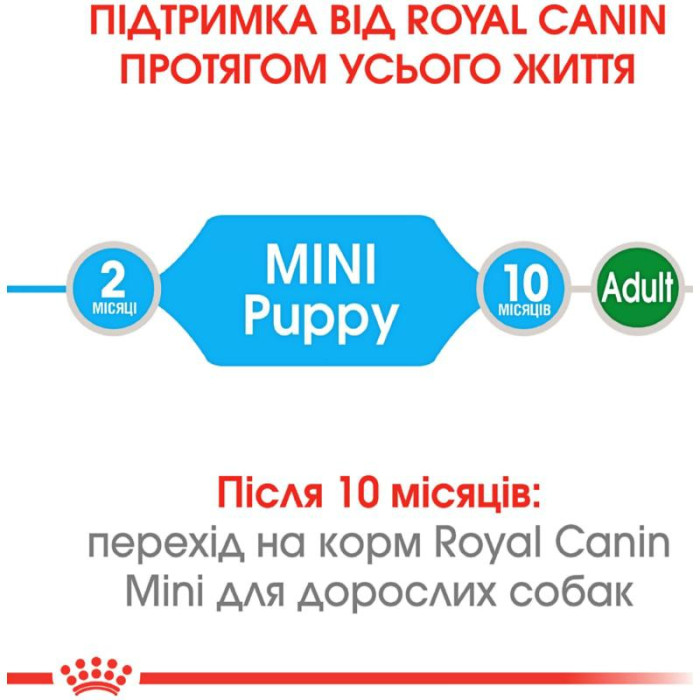 РЕКОМЕНДАЦІЇ: Рекомендується годувати Royal Canin Mini Puppy двічі на день. Розмір порції залежить від ваги, віку та рівня активності цуценяти. Рекомендовано забезпечувати вільний доступ до прісної води впродовж дня.